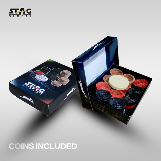 Stag Global Professional Black Carrom Board | with 9 Neon Orange & 9 Neon Green Carrom Coins, and a Striker (Without Wheel)