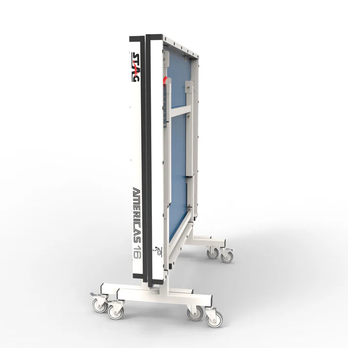Crafted with an aluminum top, wood frame, and base, the Stag Americas series ping pong table delivers the perfect blend of strength and style. Whether you're setting up in a home game room or a sports facility, this foldable professional table tennis table adapts with ease.