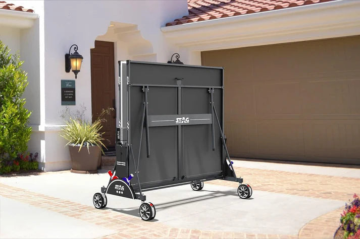 Stag Bali weatherproof outdoor table tennis table with foldable design, smooth wheels, and durable build—ideal for patios, gardens, and clubs.